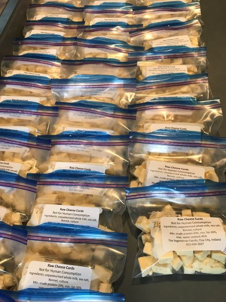 A wide variety of raw dairy products labeled as pet food, crafted from the milk of 100% grass fed cows on the Yegerlehner farm.
